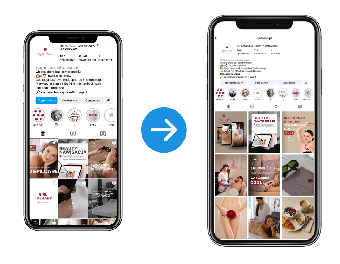We built a structured, visually consistent, and conversion-oriented social presence. The Polish-language content strategy unified Reels, posts, and stories within the Epil Care aesthetic — highlighting expertise, authenticity, and a touch of humor, while preserving the premium image. The result: +180% engagement, a steady booking flow, and higher brand recognition across Warsaw.